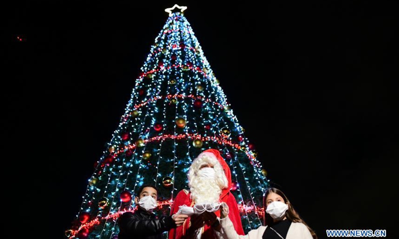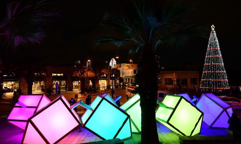 Photo taken on Dec. 6, 2020 shows a view of a Christmas tree after a lighting ceremony amid the COVID-19 pandemic in central Israeli city of Tel Aviv. (Tomer Neuberg/JINI via Xinhua)
