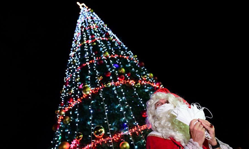 A citizen dressed up as Santa Claus poses in front of a Christmas tree after a lighting ceremony amid the COVID-19 pandemic in central Israeli city of Tel Aviv, on Dec. 6, 2020. (Tomer Neuberg/JINI via Xinhua)