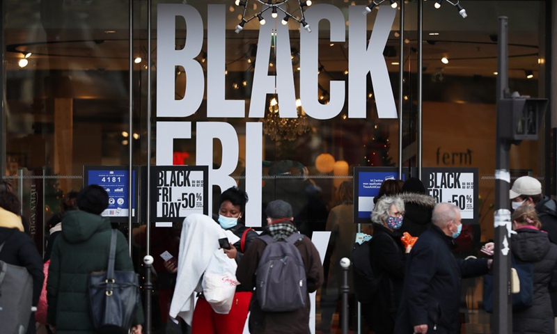 People walk past posters about "Black Friday" in Paris, France, Dec. 4, 2020. Postponed a week due to the national lockdown, the annual "Black Friday" started on Friday.(Photo: Xinhua)