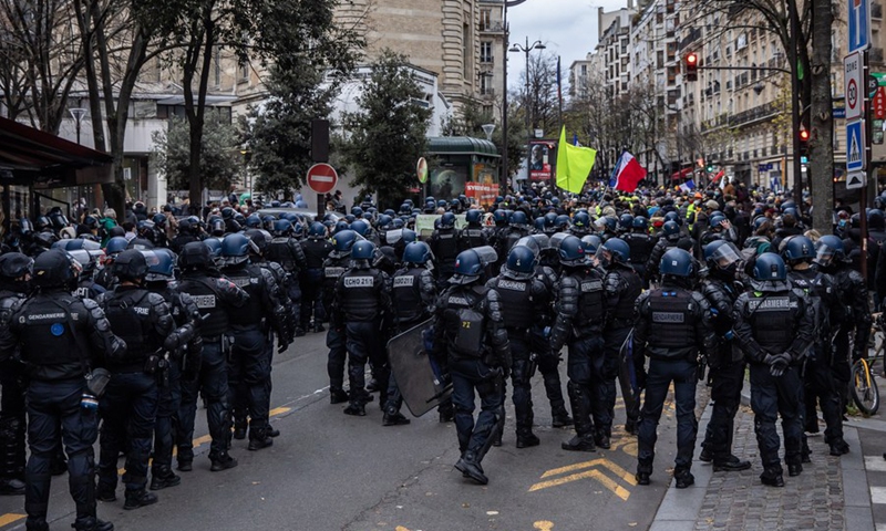 Gendarmes guard during a demonstration in Paris, France, Dec. 5, 2020. Paris police made 22 arrests on Saturday after violence flared up in a demonstration against police brutality and a controversial bill. (Photo: Xinhua)
