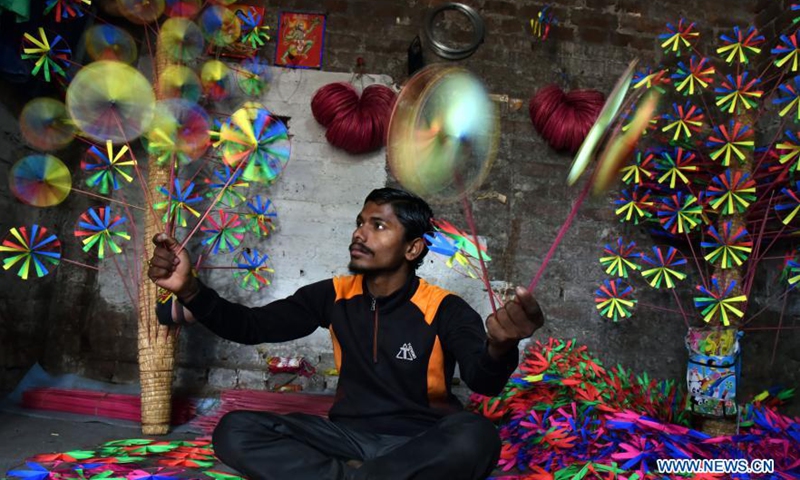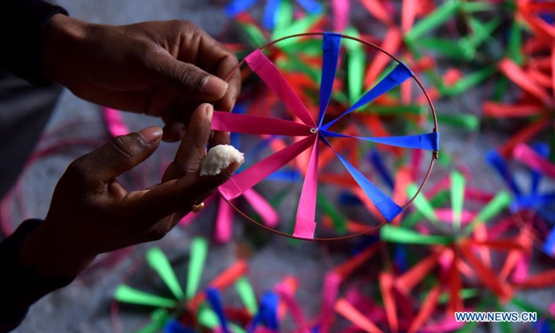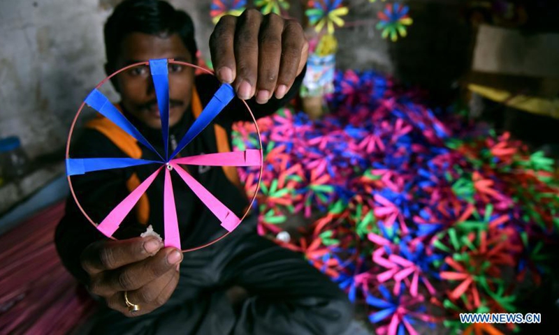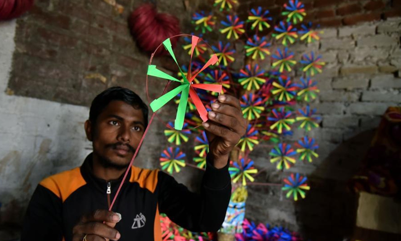A man makes paper wheel toys for sale in Jammu, the winter capital of Indian-controlled Kashmir, Dec. 7, 2020. (Str/Xinhua)