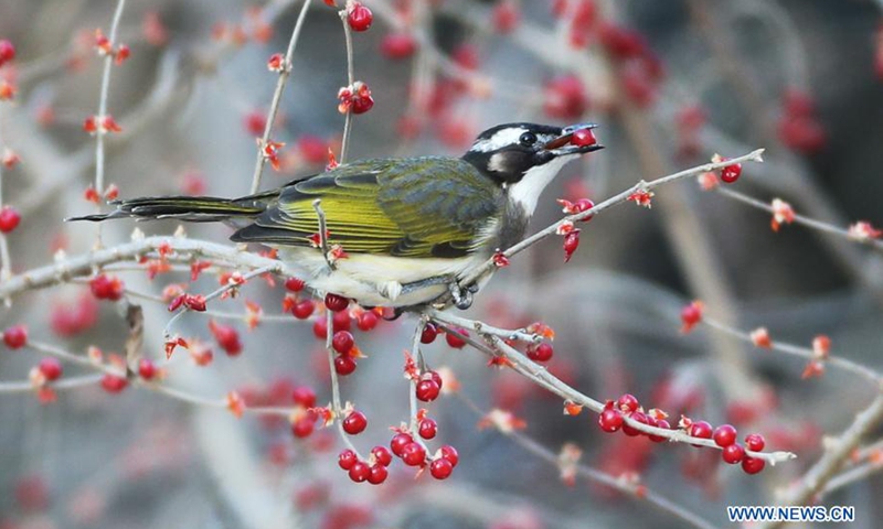 Photo taken on Dec. 7, 2020 shows a light-vented bulbul at Renmin Park in Zhangjiakou, north China's Hebei Province. (Photo: Xinhua)