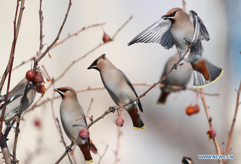 Photo taken on Dec. 7, 2020 shows waxwing birds at Renmin Park in Zhangjiakou, north China's Hebei Province.(Photo: Xinhua)
