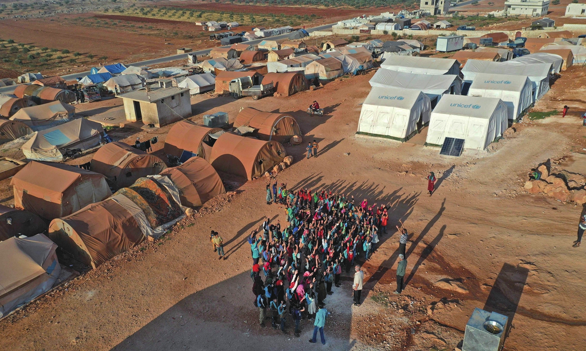 Displaced Syrian youths line up ahead of classes, after tents were transformed to classrooms, at a camp for the internally displaced in the town of Maarrat Misrin in Syria's northwestern Idlib Province on October 6. Photo: VCG