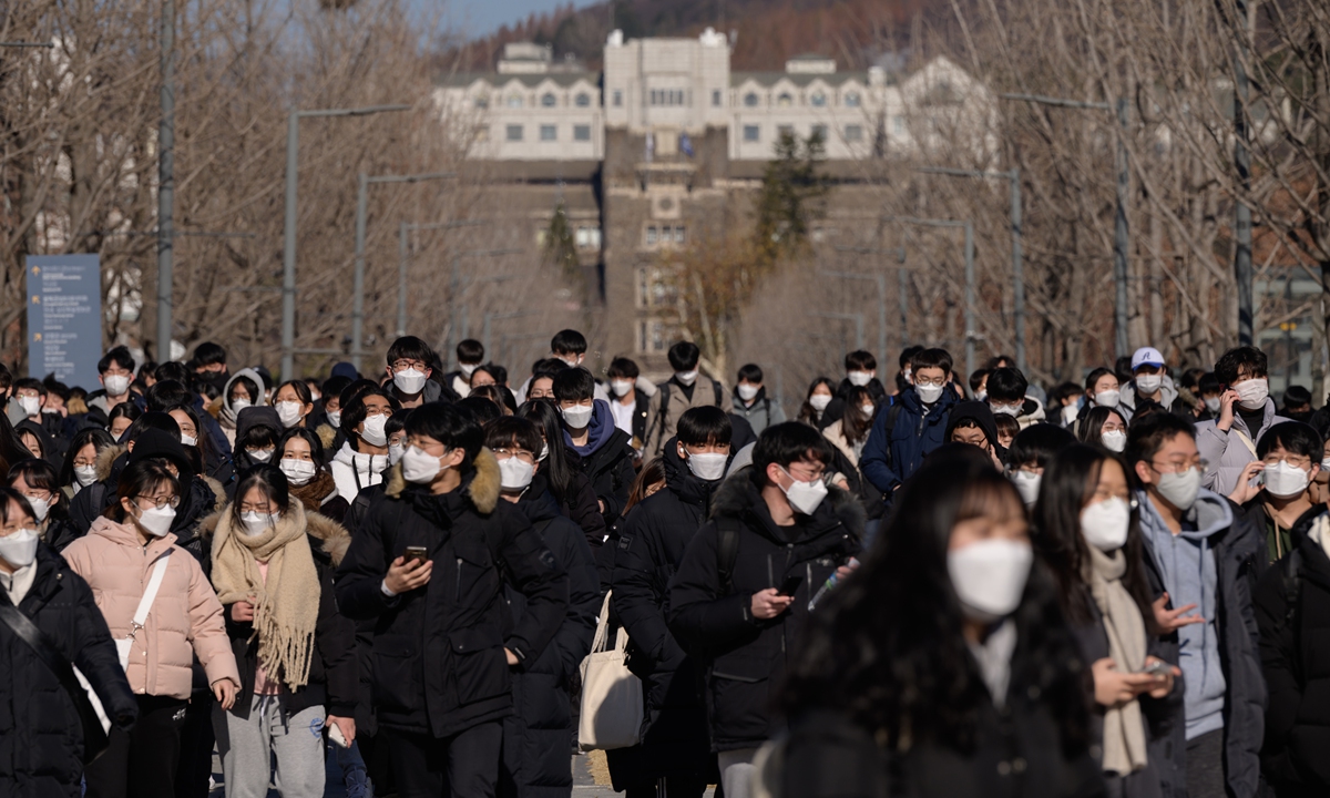High-school students make their way to and from sitting "Susi" college admissions exams, outside the gates of Yonsei university in Seoul, South Korea on Tuesday. Photo: AFP