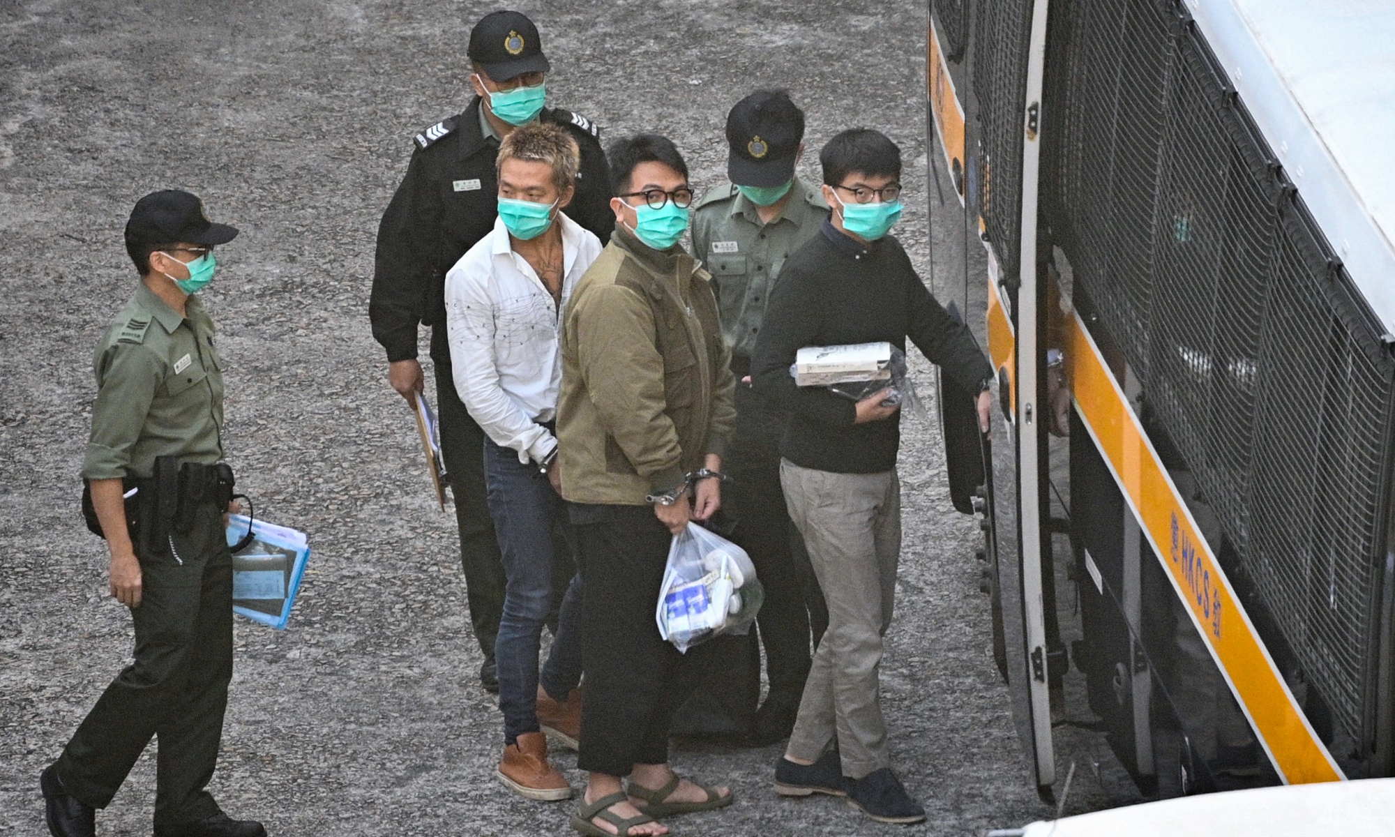 Ivan Lam (left) and Joshua Wong (right) are seen entering a prison van at Lai Chi Kok Reception Centre in Hong Kong on Wednesday. Hong Kong secessionist Joshua Wong was sentenced to 13.5 months in prison on two charges related to the siege of the Hong Kong police headquarters in June 2019. Fellow secessionist Agnes Chow received 10 months, and Ivan Lam seven months (See story on Page 3) Photo: AFP