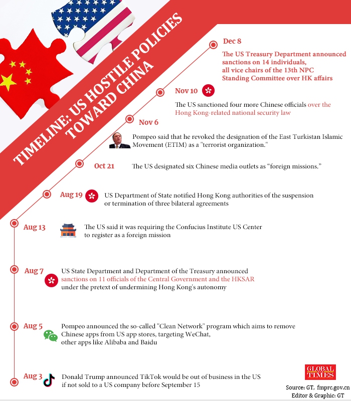 "This is a direct confrontation with China's top legislature, which shows that in his final weeks as president, Donald Trump has not given up in pushing forward its Cold War mentality toward China by escalating tensions, creating more problems for Biden," Tian Feilong, an associate professor at Beihang University in Beijing and a member of the Beijing-based Chinese Association of Hong Kong and Macao Studies, told the Global Times on Tuesday.