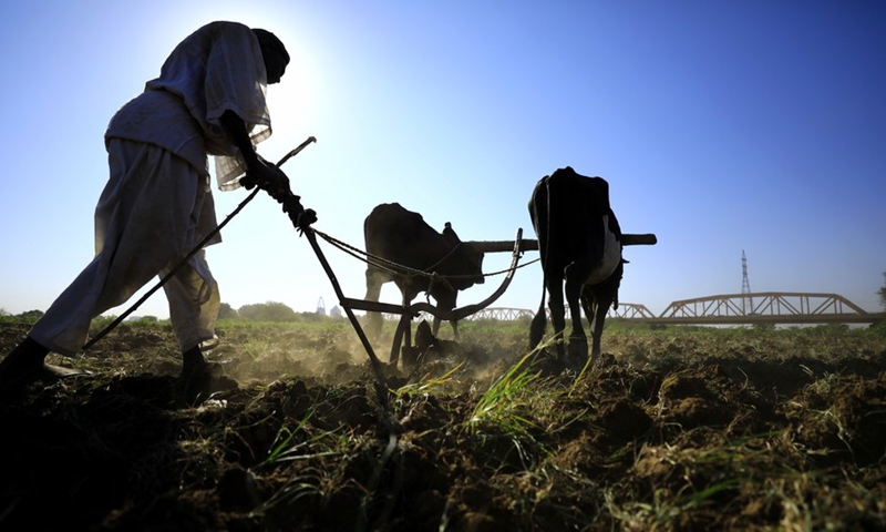 A farmer opens a furrow in the field with an ox-drawn plough near the confluence of the White Nile and Blue Nile, also known as Al Mugran area, in Khartoum, Sudan, Nov. 26, 2020.(Photo: Xinhua)