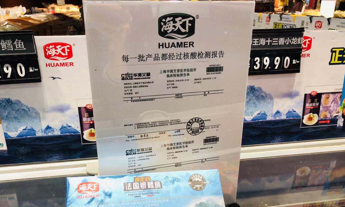 Notices in the fresh food section showed that all domestic cold-chain products on shelves had tested negative for COVID-19. Ma said the mall had not yet received notices to require real-name purchases.