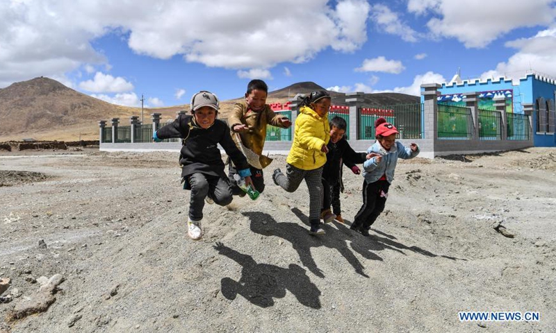 Children play near a newly-built kindergarten in Pumaqangtang Township of Nagarze County in Shannan, southwest China's Tibet Autonomous Region, April 16, 2020. Pumaqangtang, China's highest township, has an average altitude of 5,373 meters, with oxygen levels less than 40 percent of that at sea level. Villagers here used to live in earth-rock houses with no electricity, running water, vegetables or fruits available. Such hard living conditions continued until the 1970s. Nowadays, all villagers in Pumaqangtang have moved into better residences. Compared with the past, the new brick-concrete structure houses are stronger, warmer and more spacious. Every household has access to electricity and water supplies, and has their own small courtyard and toilet. All villages in the township have kindergartens, clinics, oxygen chambers and other facilities. The enrollment rate of school-age children and the retention rate of primary school students both reached 100 percent. Through the implementation of targeted strategies, the local government has developed specialized livestock industries to help increase the income of villagers. The annual per capita net income of the township reached 15,323 yuan (2,343 U.S. dollars) in 2019 and is expected to surpass 17,000 yuan (2,599 U.S. dollars) this year. Tibet has accomplished the historical feat of eradicating absolute poverty. By the end of 2019, Tibet had lifted 628,000 people out of poverty and delisted 74 county-level areas from the poverty list. (Xinhua/Jigme Dorje)