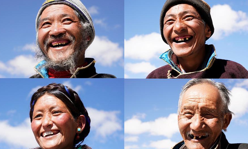 Combo photo taken in April 2020 shows villagers posing for photos in front of their new houses in Pumaqangtang Township of Nagarze County in Shannan, southwest China's Tibet Autonomous Region. Pumaqangtang, China's highest township, has an average altitude of 5,373 meters, with oxygen levels less than 40 percent of that at sea level. Villagers here used to live in earth-rock houses with no electricity, running water, vegetables or fruits available. Such hard living conditions continued until the 1970s. Nowadays, all villagers in Pumaqangtang have moved into better residences. Compared with the past, the new brick-concrete structure houses are stronger, warmer and more spacious. Every household has access to electricity and water supplies, and has their own small courtyard and toilet. All villages in the township have kindergartens, clinics, oxygen chambers and other facilities. The enrollment rate of school-age children and the retention rate of primary school students both reached 100 percent. Through the implementation of targeted strategies, the local government has developed specialized livestock industries to help increase the income of villagers. The annual per capita net income of the township reached 15,323 yuan (2,343 U.S. dollars) in 2019 and is expected to surpass 17,000 yuan (2,599 U.S. dollars) this year. Tibet has accomplished the historical feat of eradicating absolute poverty. By the end of 2019, Tibet had lifted 628,000 people out of poverty and delisted 74 county-level areas from the poverty list. (Xinhua/Purbu Zhaxi)
