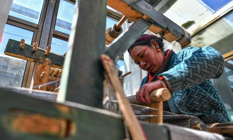 A villager weaves a woolen product in Pumaqangtang Township of Nagarze County in Shannan, southwest China's Tibet Autonomous Region, April 16, 2020. Pumaqangtang, China's highest township, has an average altitude of 5,373 meters, with oxygen levels less than 40 percent of that at sea level. Villagers here used to live in earth-rock houses with no electricity, running water, vegetables or fruits available. Such hard living conditions continued until the 1970s. Nowadays, all villagers in Pumaqangtang have moved into better residences. Compared with the past, the new brick-concrete structure houses are stronger, warmer and more spacious. Every household has access to electricity and water supplies, and has their own small courtyard and toilet. All villages in the township have kindergartens, clinics, oxygen chambers and other facilities. The enrollment rate of school-age children and the retention rate of primary school students both reached 100 percent. Through the implementation of targeted strategies, the local government has developed specialized livestock industries to help increase the income of villagers. The annual per capita net income of the township reached 15,323 yuan (2,343 U.S. dollars) in 2019 and is expected to surpass 17,000 yuan (2,599 U.S. dollars) this year. Tibet has accomplished the historical feat of eradicating absolute poverty. By the end of 2019, Tibet had lifted 628,000 people out of poverty and delisted 74 county-level areas from the poverty list. (Xinhua/Jigme Dorje)