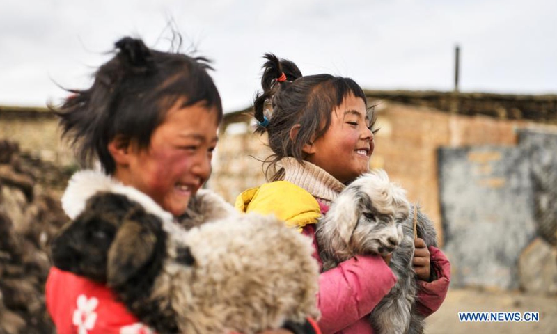 Children hold lambs in Pumaqangtang Township of Nagarze County in Shannan, southwest China's Tibet Autonomous Region, April 15, 2020. Pumaqangtang, China's highest township, has an average altitude of 5,373 meters, with oxygen levels less than 40 percent of that at sea level. Villagers here used to live in earth-rock houses with no electricity, running water, vegetables or fruits available. Such hard living conditions continued until the 1970s. Nowadays, all villagers in Pumaqangtang have moved into better residences. Compared with the past, the new brick-concrete structure houses are stronger, warmer and more spacious. Every household has access to electricity and water supplies, and has their own small courtyard and toilet. All villages in the township have kindergartens, clinics, oxygen chambers and other facilities. The enrollment rate of school-age children and the retention rate of primary school students both reached 100 percent. Through the implementation of targeted strategies, the local government has developed specialized livestock industries to help increase the income of villagers. The annual per capita net income of the township reached 15,323 yuan (2,343 U.S. dollars) in 2019 and is expected to surpass 17,000 yuan (2,599 U.S. dollars) this year. Tibet has accomplished the historical feat of eradicating absolute poverty. By the end of 2019, Tibet had lifted 628,000 people out of poverty and delisted 74 county-level areas from the poverty list. (Xinhua/Jigme Dorje)