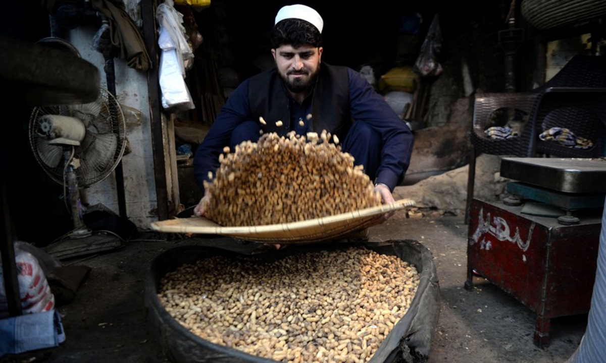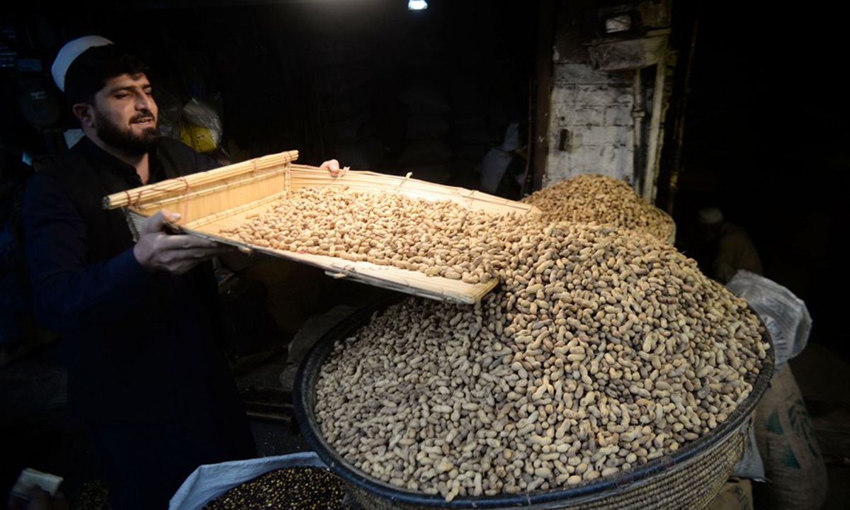 A vendor arranges peanuts at a shop in northwest Pakistan's Peshawar on Dec. 9, 2020. (Photo by Umar Qayyum/Xinhua)