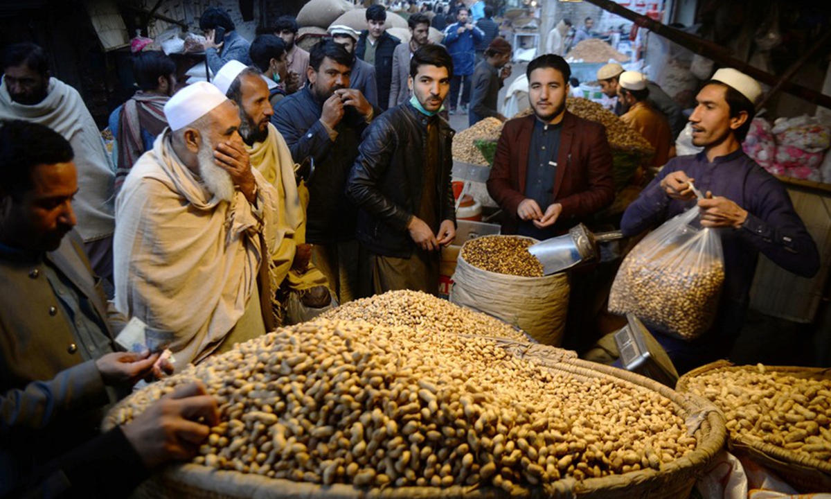 People buy peanuts at a shop in northwest Pakistan's Peshawar on Dec. 9, 2020. (Photo by Umar Qayyum/Xinhua)