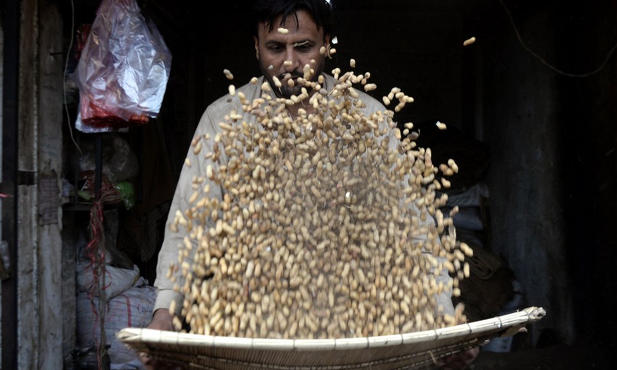 A vendor winnows peanuts at a shop in northwest Pakistan's Peshawar on Dec. 9, 2020. (Photo by Umar Qayyum/Xinhua)