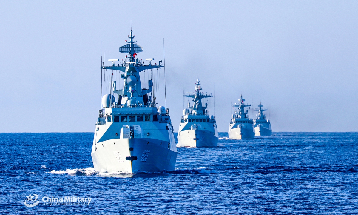 The frigate Enshi (Hull 627), Yongzhou (Hull 628), Bazhong (Hull 625), and Wuzhou (Hull 626) steam in formation during a 9-day maritime training exercise in waters of the South China Sea in late November, 2020. They are attached to a frigate flotilla of the navy under the PLA Southern Theater Command.Photo:China Military