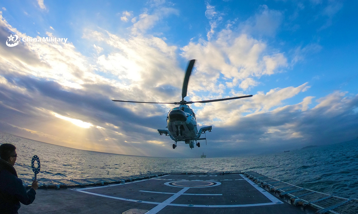 A ship-borne helicopter attached to a flotilla of the navy under the PLA Southern Theater Command prepares to land on the flight deck of the frigate Enshi (Hull 627) during a 9-day maritime training exercise in late November, 2020. Photo:China Military