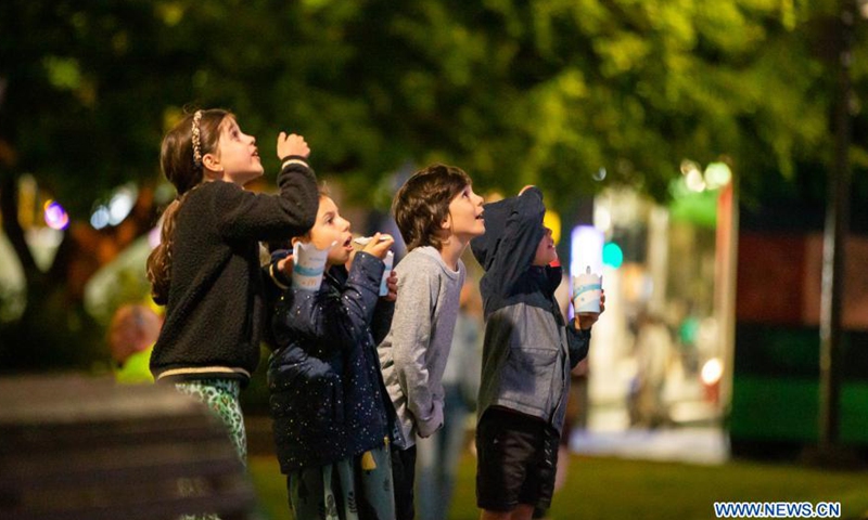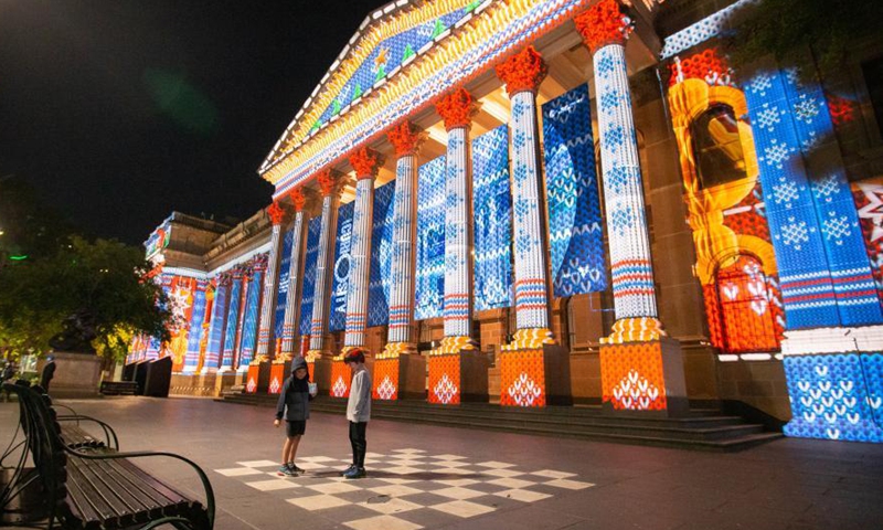 Children view the Christmas light projections in Melbourne, Australia, on Dec. 10, 2020. Melbourne's popular Christmas projections cover some significant sites including the State Library Victoria, the Melbourne Town Hall and Princes Bridge from Nov. 27, 2020 to Jan. 3, 2021. The projections at the State Library Victoria feature a thank-you tribute to heroes fighting against the COVID-19 pandemic in the city.Photo:Xinhua