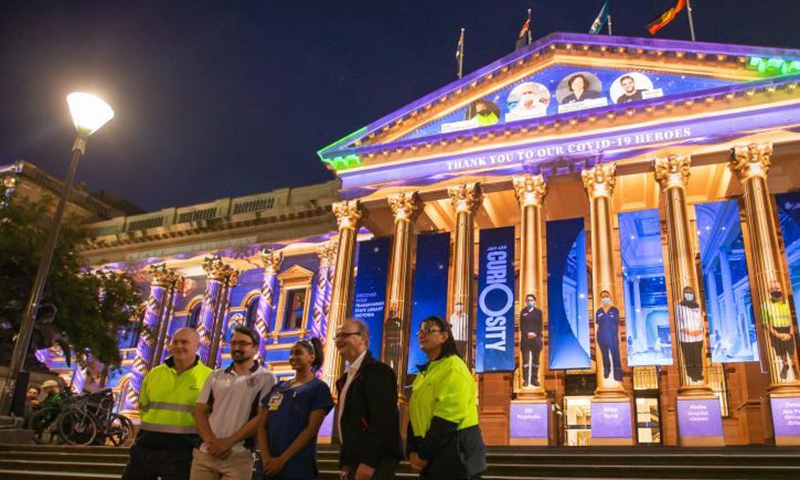 Heroes fighting against the COVID-19 pandemic pose for photo in front of the thank-you light projections at the State Library Victoria in Melbourne, Australia, on Dec. 10, 2020. Melbourne's popular Christmas projections cover some significant sites including the State Library Victoria, the Melbourne Town Hall and Princes Bridge from Nov. 27, 2020 to Jan. 3, 2021. The projections at the State Library Victoria feature a thank-you tribute to heroes fighting against the COVID-19 pandemic in the city.Photo:Xinhua