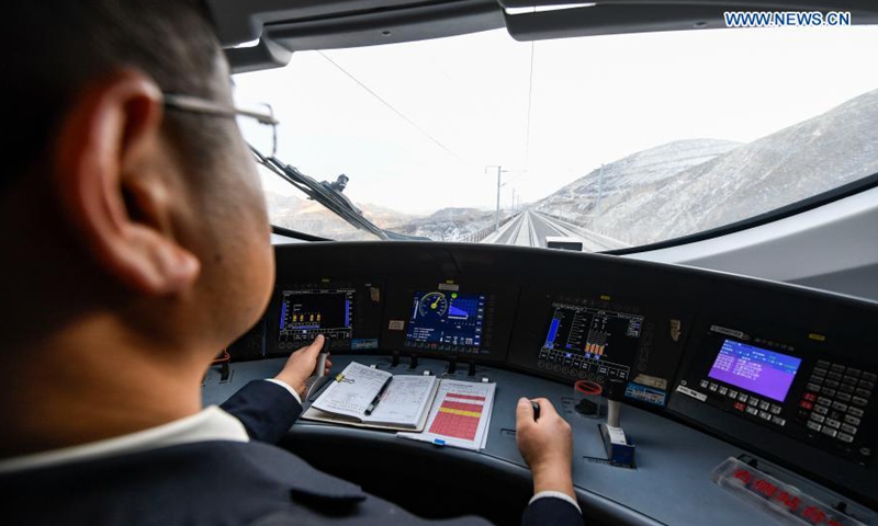 Train driver Xu Rui controls a high-speed train during a trial operation of the Yinchuan-Xi'an high-speed railway, Dec. 12, 2020. The Yinchuan-Xi'an high-speed railway is about to be put into service. (Xinhua/Feng Kaihua)