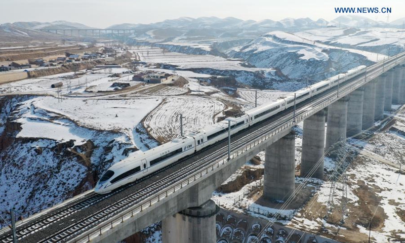 Aerial photo taken on Dec. 12, 2020 shows a bullet train running across Mafanggou grand bridge during a trial operation of the Yinchuan-Xi'an high-speed railway. The Yinchuan-Xi'an high-speed railway is about to be put into service. (Xinhua/Chen Bin)
