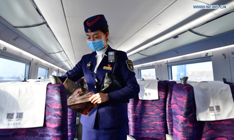 Chief conductor Dong Fang patrols on a high-speed train during a trial operation of the Yinchuan-Xi'an high-speed railway, Dec. 12, 2020. The Yinchuan-Xi'an high-speed railway is about to be put into service. (Xinhua/Chen Bin)