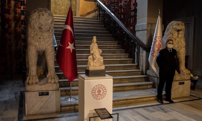 Photo taken on Dec. 13, 2020 shows the statue of Cybele displayed at the press conference in Istanbul, Turkey. The 1,700-year-old statue of Cybele, the symbol of abundance and fertility, was brought back to Turkey after being smuggled abroad nearly 60 years ago, Turkish Culture and Tourism Minister Mehmet Nuri Ersoy announced Sunday. (Photo by Osman Orsal/Xinhua)