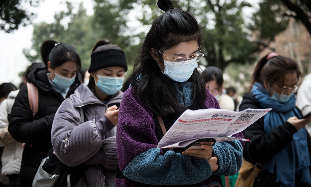 Hopefuls line up for the 2021 civil service exam at Huazhong University of Science and Technology in Wuhan, capital of Central China's Hubei Province on Sunday. China will recruit 25,700 civil servants to work for 79 central government agencies and 23 institutions directly under them in 2021. About 1.57 million are qualified to take the exam, making the competitive ratio 61:1. Photo:IC