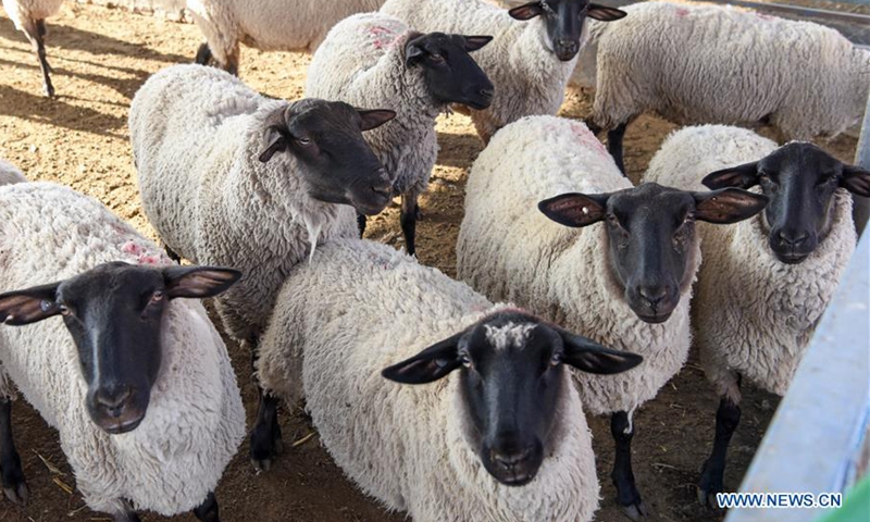 Photo taken on Oct. 19, 2020 shows a herd of Suffolk sheep at an animal husbandry company in Manas County, northwest China's Xinjiang Uygur Autonomous Region. (Xinhua/Ding Lei)