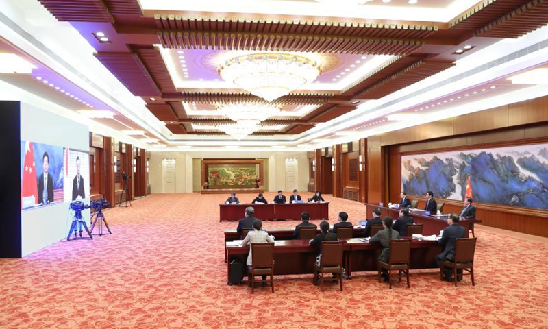 Li Zhanshu, chairman of the National People's Congress (NPC) Standing Committee, holds video talks with Tadamori Oshima, speaker of the House of Representatives of the Japanese parliament, at the Great Hall of the People in Beijing, capital of China, Dec. 15, 2020. (Xinhua/Ding Haitao)
