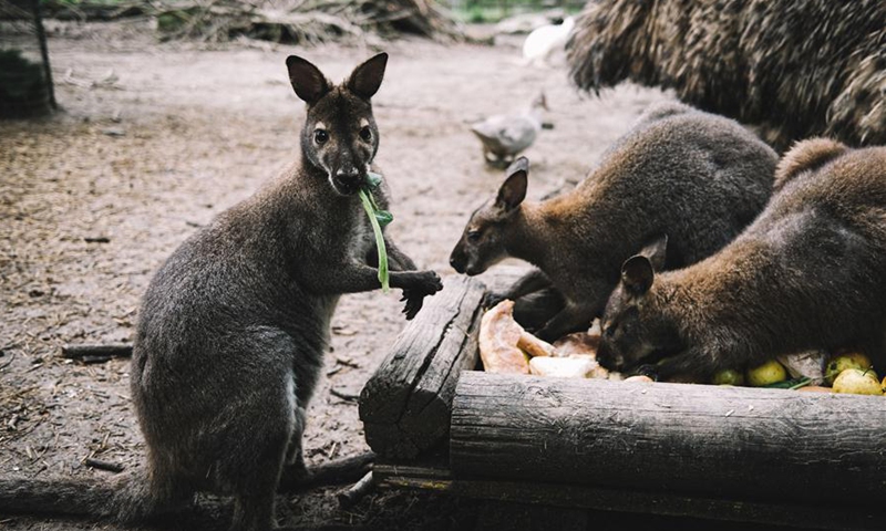 Kangaroos eat food at Langhe safari park in Murazzano, Italy, May 20, 2020. The Langhe safari park has been closed since March due to the COVID-19 pandemic. In order to continue feeding and taking care of the animals, the park has to seek help from restaurateurs, farmers and shopkeepers to donate food to feed the animals.Photo:Xinhua