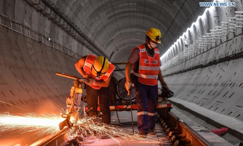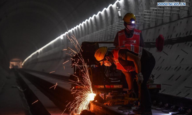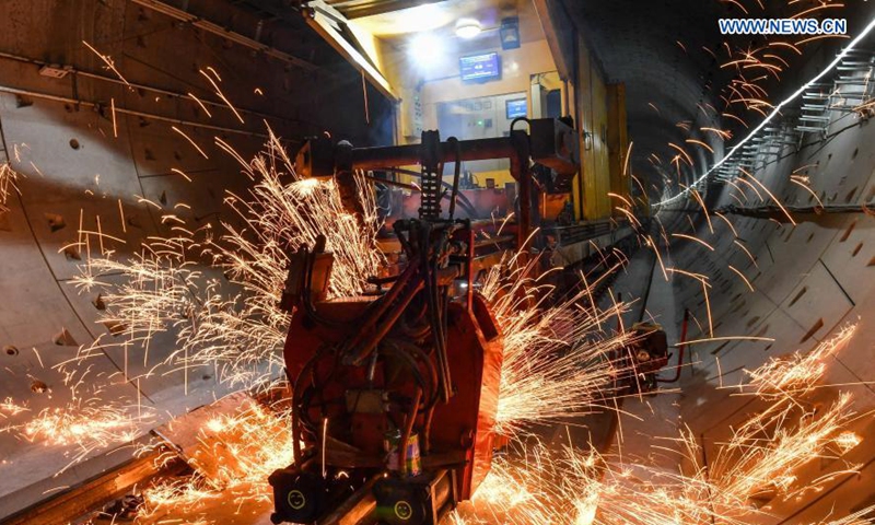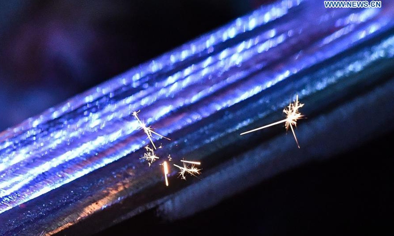 Welding sparks are seen on the track of the Guangzhou Metro Line 18 in Guangzhou, south China's Guangdong Province, on Dec. 16, 2020. A total of 122.6 kilometers of railway tracks will need to be laid for the Guangzhou Metro Line 18, a subway line which is under construction with a maximum designed speed of 160 kilometers per hour. (Xinhua/Liu Dawei)