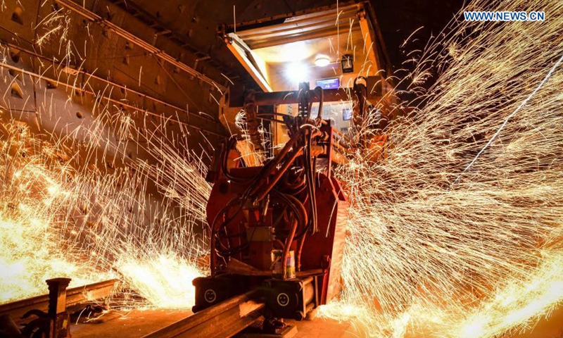Sparks fly as a rail mobile flash butt welding machine works on the track of the Guangzhou Metro Line 18 in Guangzhou, south China's Guangdong Province, on Dec. 16, 2020. A total of 122.6 kilometers of railway tracks will need to be laid for the Guangzhou Metro Line 18, a subway line which is under construction with a maximum designed speed of 160 kilometers per hour. (Xinhua/Liu Dawei)