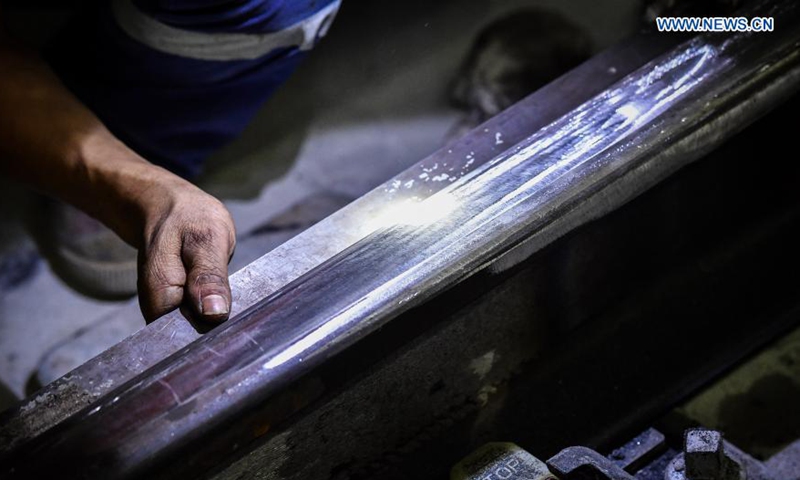 A worker measures the flatness of a welded joint on the track at the construction site of the Guangzhou Metro Line 18 in Guangzhou, south China's Guangdong Province, on Dec. 16, 2020. A total of 122.6 kilometers of railway tracks will need to be laid for the Guangzhou Metro Line 18, a subway line which is under construction with a maximum designed speed of 160 kilometers per hour. (Xinhua/Liu Dawei)