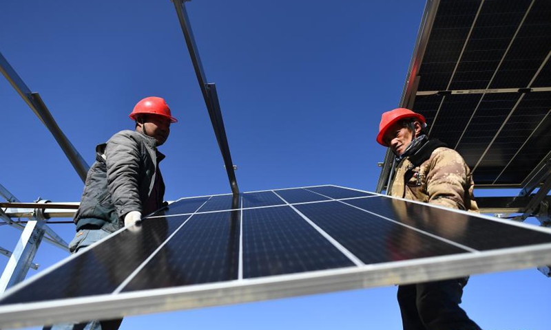 Workers install a solar power unit at the construction site of a 300-MW photovoltaic electricity project of the China Datang Corporation Ltd. in Gonghe County, Tibetan Autonomous Prefecture of Hainan in northwest China's Qinghai Province, Dec. 15, 2020. (Xinhua/Zhang Hongxiang)