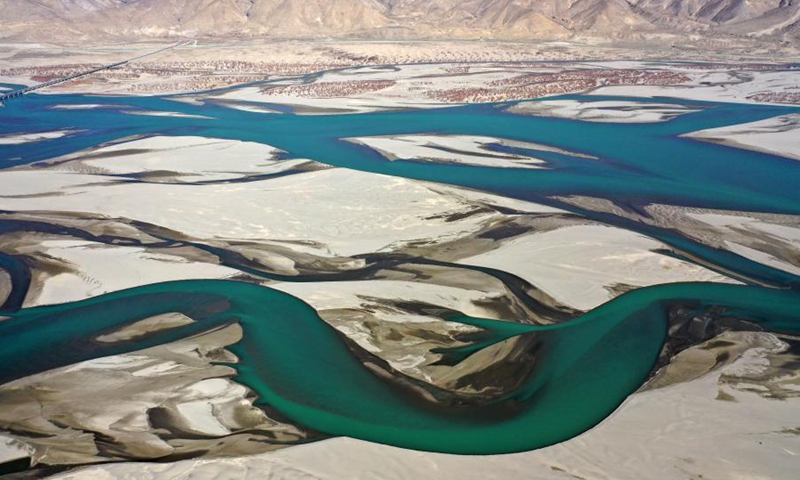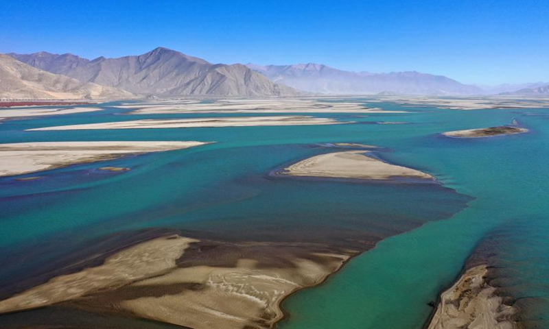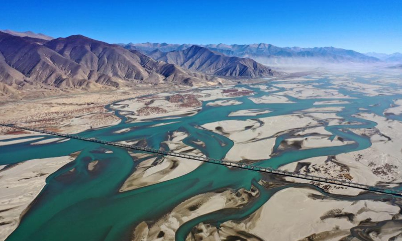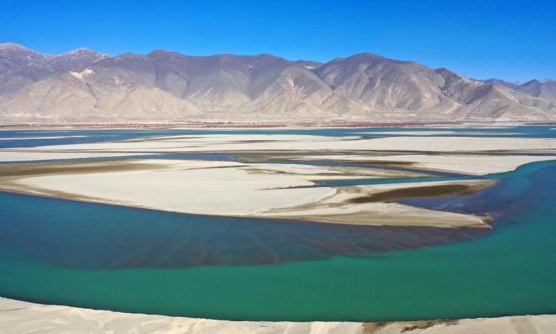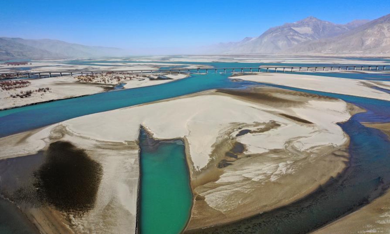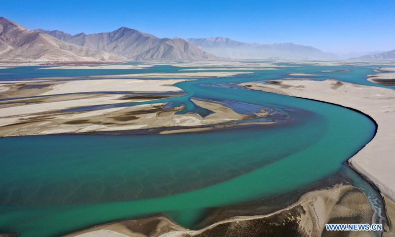 Aerial photo taken on Dec. 16, 2020 shows a view over the Yarlung Zangbo River in Zhanang County, Shannan City of southwest China's Tibet Autonomous Region. (Xinhua/Zhan Yan)