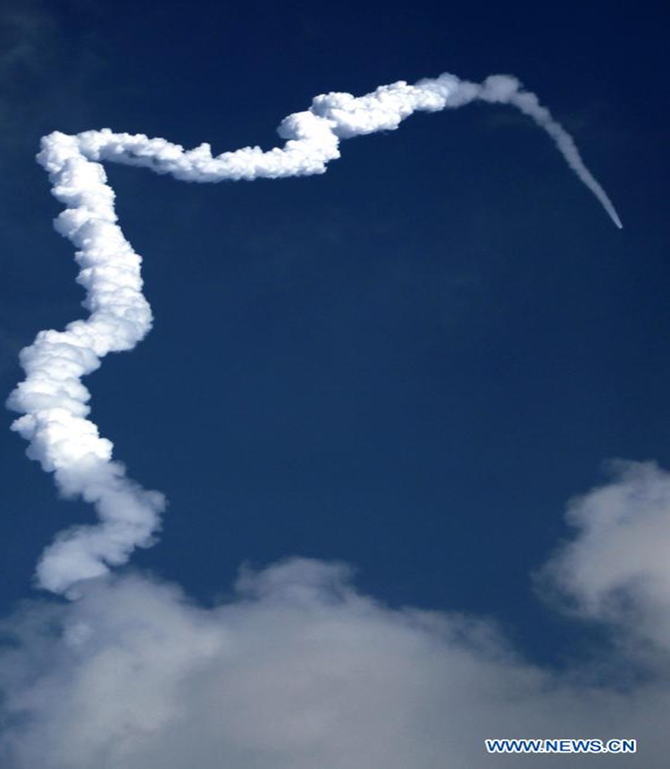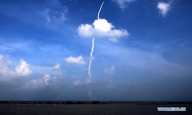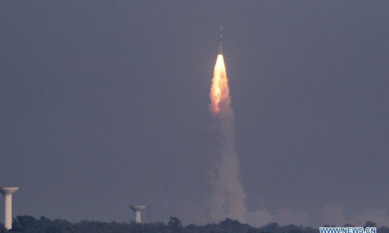 The communication satellite CMS-01 onboard Polar Satellite Launch Vehicle -- PSLV-C50 is launched from the second launch pad of Satish Dhawan Space Centre (SDSC) in Sriharikota, off the Bay of Bengal coast located in the southern Indian state of Andhra Pradesh on Dec. 17, 2020. The Indian Space Research Organisation (ISRO) Thursday successfully launched a communication satellite CMS-01 onboard Polar Satellite Launch Vehicle -- PSLV-C50, officials said. (Str/Xinhua)
