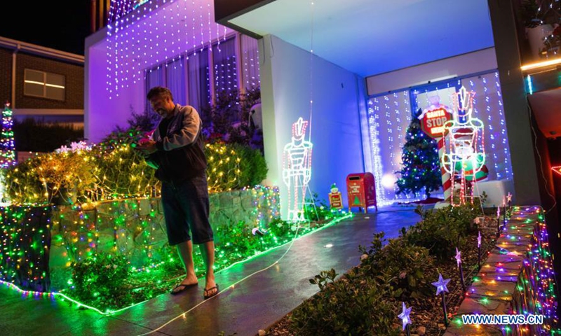 Photo taken on Dec. 18, 2020 shows Christmas decorations and lights in a community in Canberra, Australia. (Photo by Chu Chen/Xinhua)