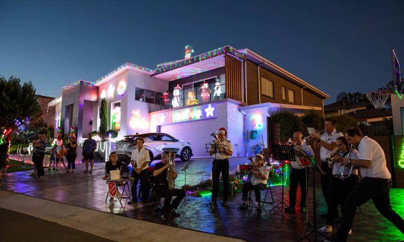 A band performs in a community with Christmas decorations in Canberra, Australia, Dec. 18, 2020. (Photo by Chu Chen/Xinhua)