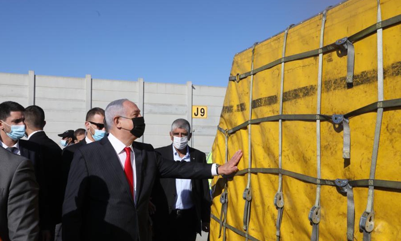 Israeli Prime Minister Benjamin Netanyahu (2nd right) attends a ceremony to mark the arrival of a plane of the international courier company DHL carrying the first batch of Pfizer coronavirus vaccines which lands at Ben Gurion International Airport near central Israeli city of Tel Aviv amid the COVID-19 pandemic on December 9, 2020. An initial shipment of COVID-19 vaccines from Pfizer arrived in Israel on Wednesday morning, the first of about 8 million Pfizer vaccines that the country is expected to receive. A DHL cargo flight from Belgium's Brussels landed at the Ben Gurion airport outside Tel Aviv, carrying a small number of vaccines for a pilot run of the logistic of transportation and refrigerated storage procedure, the Israeli health ministry said in a statement. Photo: Xinhua