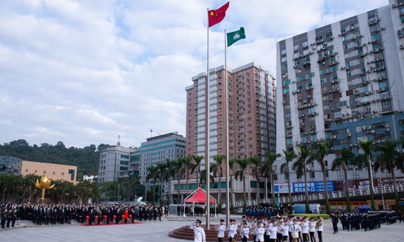 A flag-raising ceremony marking the 21st anniversary of Macao's return to the motherland is held at the Golden Lotus Square in Macao, south China, Dec. 20, 2020. (Xinhua/Cheong Kam Ka)
