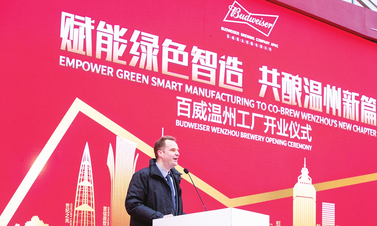 Cochair and CEO of Budweiser APAC Jan Craps speaks at the opening ceremony for the brewery on Friday. Photos: Courtesy of Budweiser