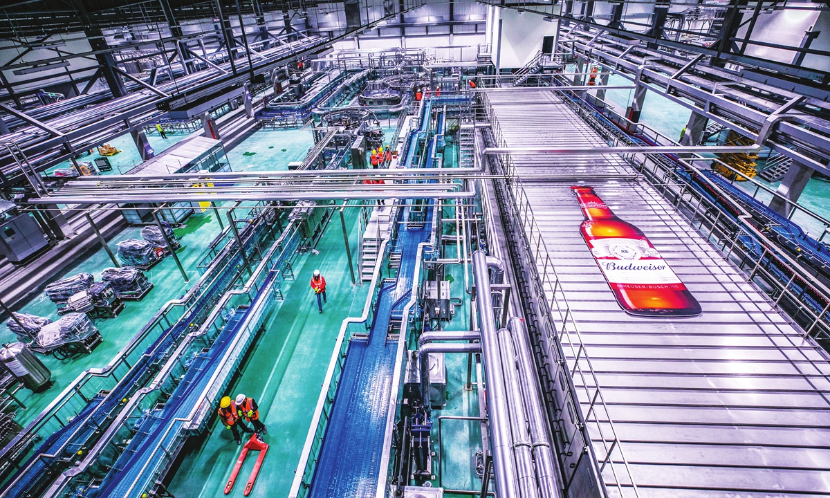 Employees work in Budweiser's smart, green and future brewery in Wenzhou, East China's Zhejiang Province.