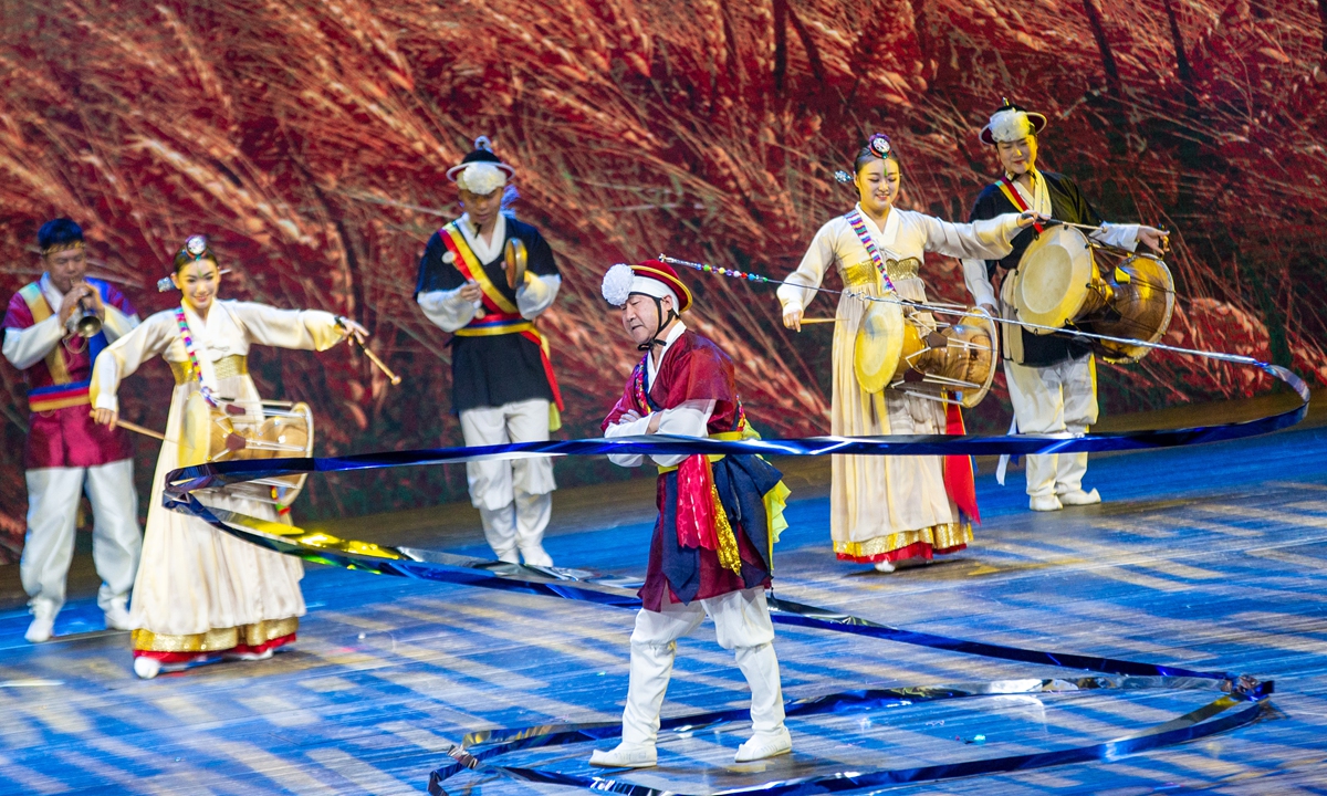 Gathering for community festivals, members of the Korean ethnic group in Jilin and other provinces in Northeast China take part in the Farmers' dance. Musicians play the oboe-like suona, bell-shaped gongs and a variety of drums, while dancers move to the beat with movements inspired by the motions of farming.