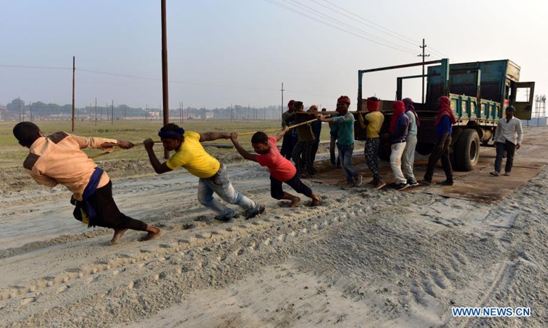 Workers pull an iron plate with a rope which is used in making a temporary road on the bank of the Ganges river, for the upcoming month-long annual Magh Mela, a Hindu festival, amid the COVID-19 pandemic, in Prayagraj, India's northern state of Uttar Pradesh, Dec. 21, 2020. (Xinhua)