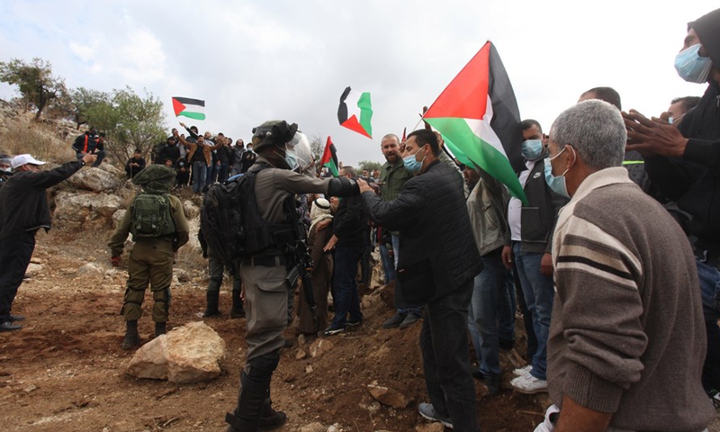 Palestinian protesters clash with Israeli soldiers and members of Israeli border police following a protest against the expansion of Jewish settlements in the West Bank village of Beit Dajan, east of Nablus, Nov. 6, 2020. (Photo by Nidal Eshtayeh/Xinhua)