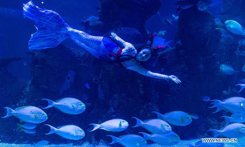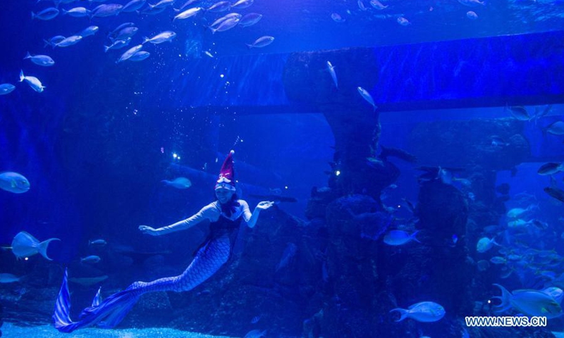 A diver wearing mermaid costume and Santa Claus hat greets visitors under water at the Jakarta Aquarium in Jakarta, Indonesia, Dec. 21, 2020. (Xinhua/Veri Sanovri)