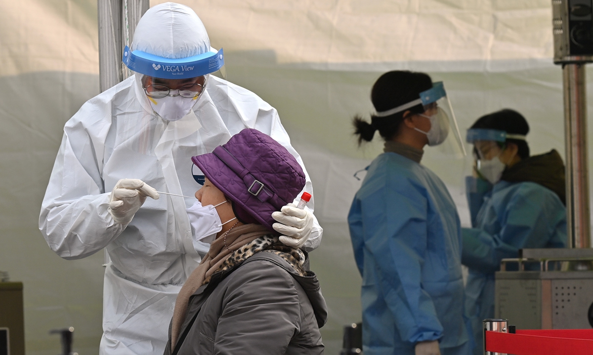 A medical staff member takes a swab from a visitor to test for the coronavirus at a temporary testing station in Seoul, South Korea on Tuesday. South Korea moved to shut down all ski resorts and winter tourist spots in a bid to stop the coronavirus spreading as a third wave of the pandemic proves much tougher to contain in the densely populated region around the capital city. Photo: AFP