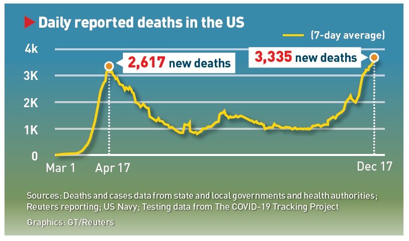 Despite pleas by health officials not to travel during the end-year holiday season, 3.2 million people were screened at US airports on Friday, Saturday and Sunday. Health officials are worried that a surge in infections from holiday gatherings could overwhelm hospitals, some of which are already at capacity after Thanksgiving celebrations. And while the country has begun to administer two new vaccines, it may be months before the inoculations put a dent in the coronavirus outbreak.